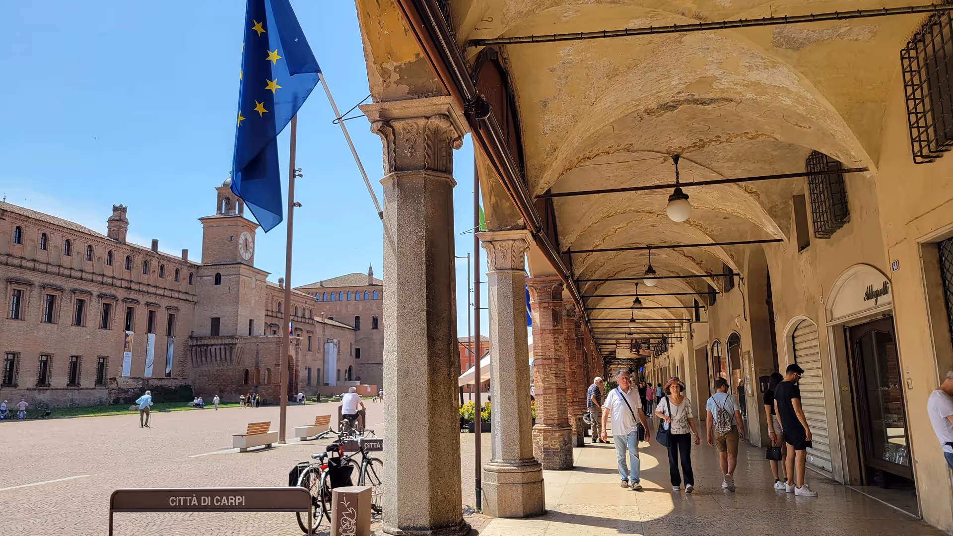 We visited Carpi in early June and could already see all the people avoiding walking through the middle of the massive piazza and instead sticking to the shade in the portici (us included!).