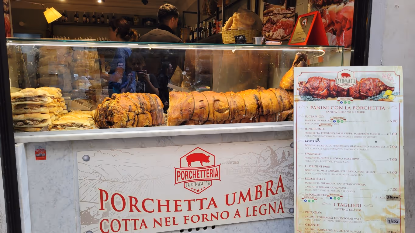 Porchetta is a type of roasted pork commonly found in Rome. Since the whole pork is roasted to make porchetta, it's not a common dish to find at homes but instead is an easy to find street food.