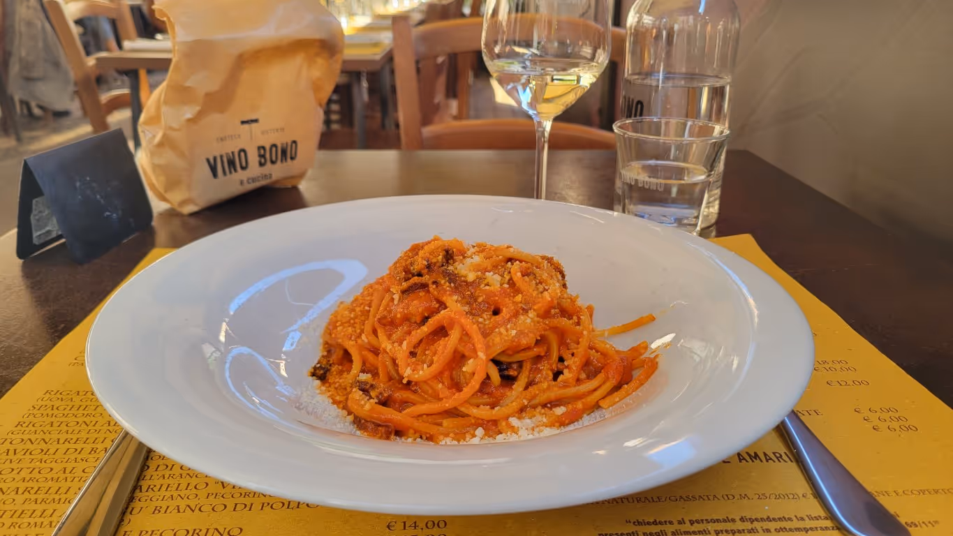 You can find amatriciana on menus all around Rome but I think my favorite (and the most affordable) has to be at Vino Bono Osteria in the northern end of Prati, one of my favorite areas of Rome.