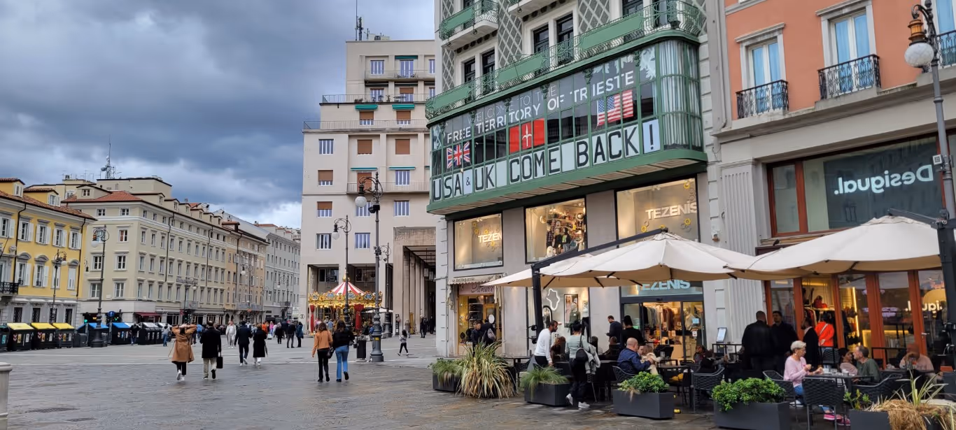 This should take you to Piazza della Borsa. This small piazza is usually quite lively and often has live music. Look up at the windows to find a giant sign that reads, "USA & UK COME BACK!" This isn't a sign I'm used to seeing when traveling and hints to the unique history of the city. After WWII, Trieste was a free territory for 7 years, providing a buffer zone between the recently liberated western Europe and Yugoslavia. During that time, the US and UK kept armies here as noted by the sign that their presence means Trieste will go back to being "free." This city really is brimming with rich history.